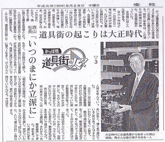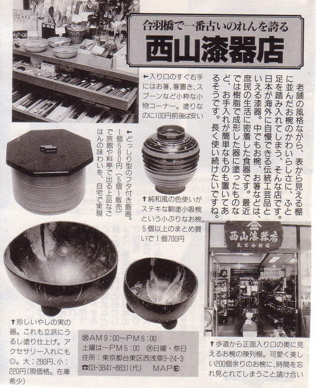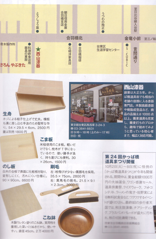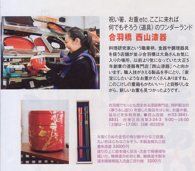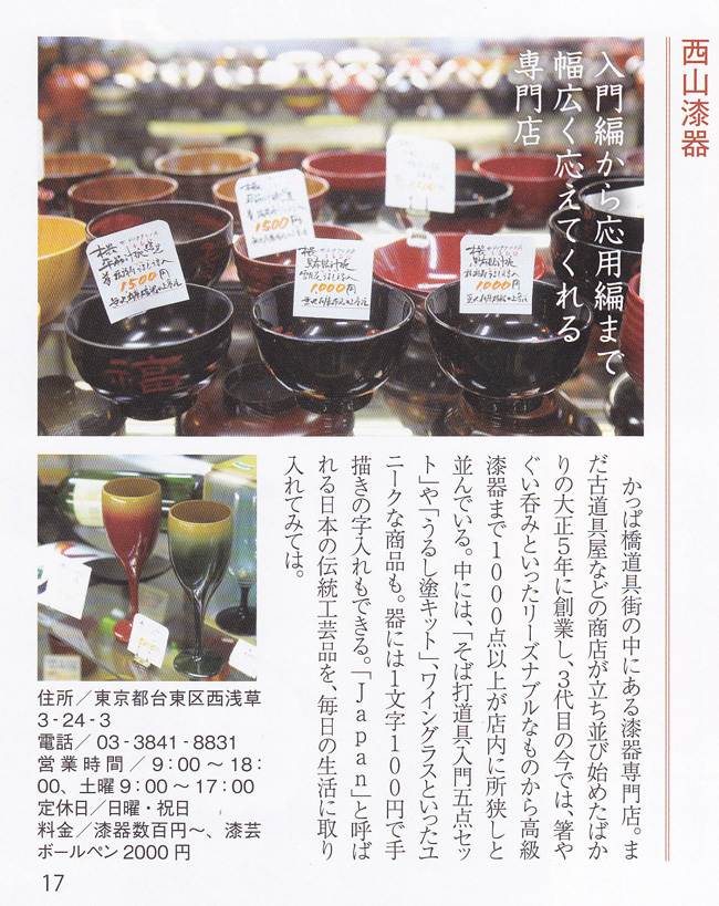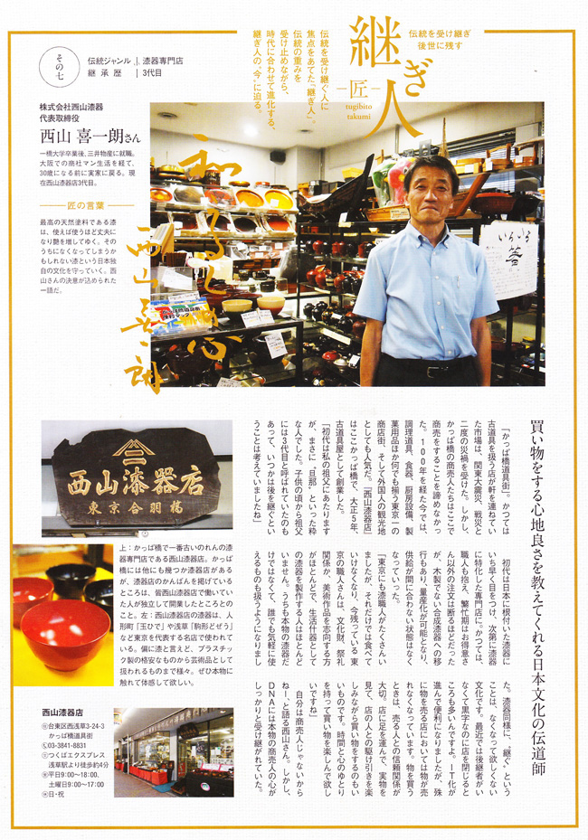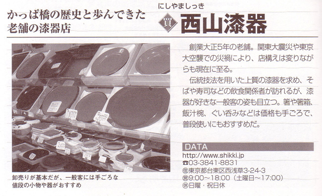 “買い物する心地よさを教えてくれる日本文化の伝道師” “かっぱ橋には他にもいくつか漆器店があるが、漆器店の看板を掲げているところは、皆西山漆器店で働いていた人が独立して開業したところとのこと。人形町「玉ひで」、浅草「駒形どぜう」など東京を代表する名店で使われている。”