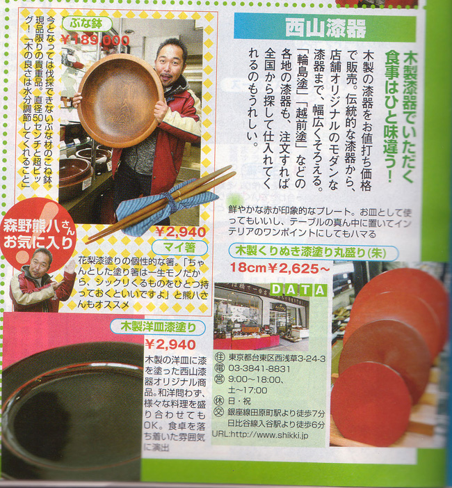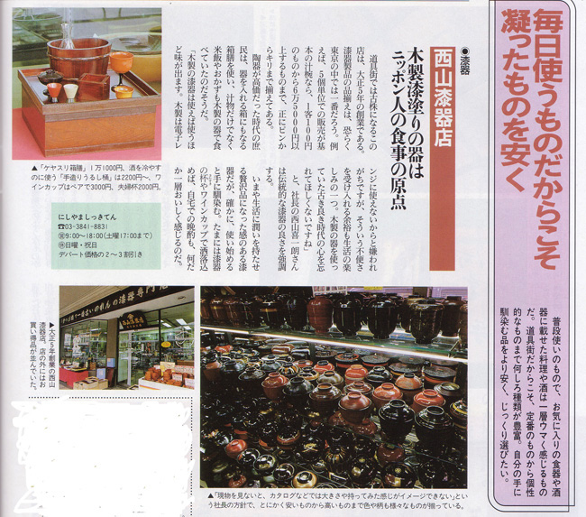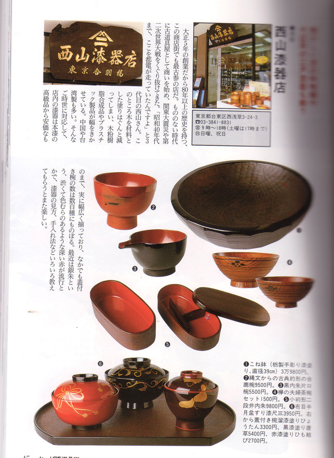 “店内の漆器は本漆の高級品から安価なものまで、実に幅広く揃っており、中でも蓋つき椀の数は数百種にものぼる。最近は銀朱という、渋くて色むらのあるような深い赤が流行とかで、漆器の見方、手入れ法などいろいろ教えてもらうとまた楽しい。”