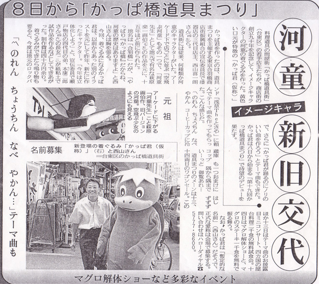 “河童 イメージキャラ 新旧交代”“料理道具の問屋街「かっぱ橋道具街」(台東区)の若手店主たちが、商店街の創立90周年を記念して、イメージキャラクターの河童の着ぐるみを作った。かっぱ君を作ったのは、道具祭りを主催する東京合羽橋商店街振興組合の宣伝委員長で漆器店の三代目当主、西山喜一朗さん(四七)ら。”