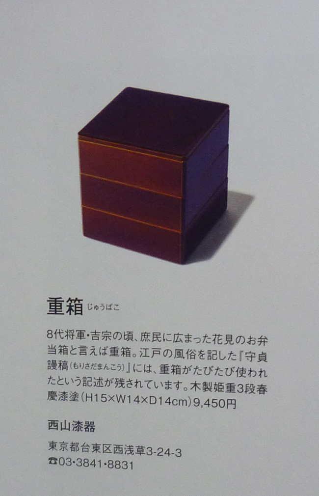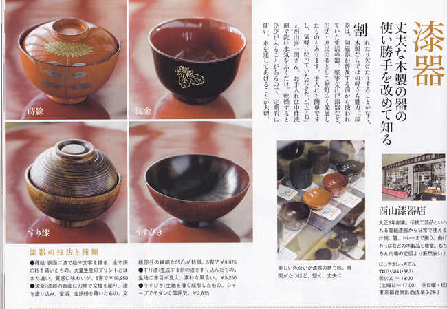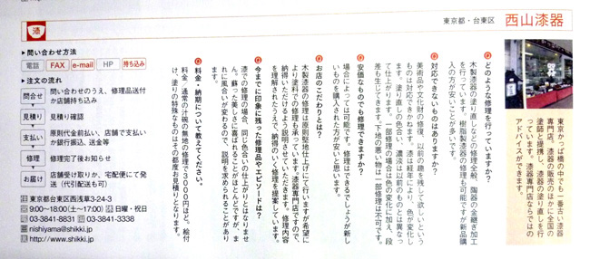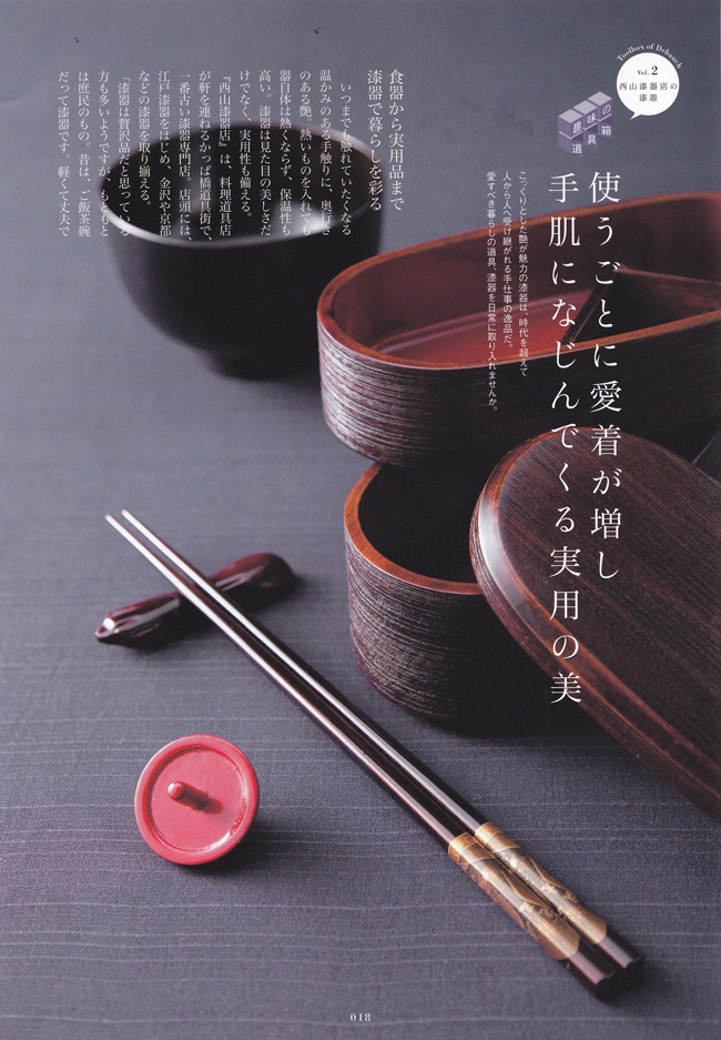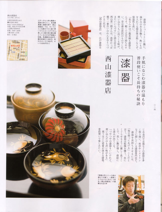 “「西山漆器店」は、江戸漆器はじめ金沢・京都などの漆器を多く取扱い、料亭やレストランなどに卸している漆器専門店だ” “漆器を長持ちさせるには、「毎日使ってあげる」ことだと言う。漆器は乾燥を嫌う。水にくぐらせるように優しく洗うことで、美しい艶が増し、蒔絵にも深みが出てくる。”
