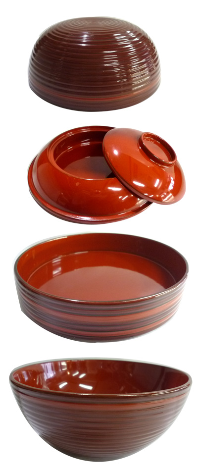 一番上のフタは逆様にすると汁椀に、中段上は蓋部分が盃になり一の椀、中段下は二の椀、下段は飯椀となります。機能的にうまく重なります。会席の飯椀・汁椀・お平・お坪・盃といった趣でしょうか。由来は武田信玄公なり、高貴な方が、鷹狩にでも出かけた折のお弁当として使われたものと思われます。