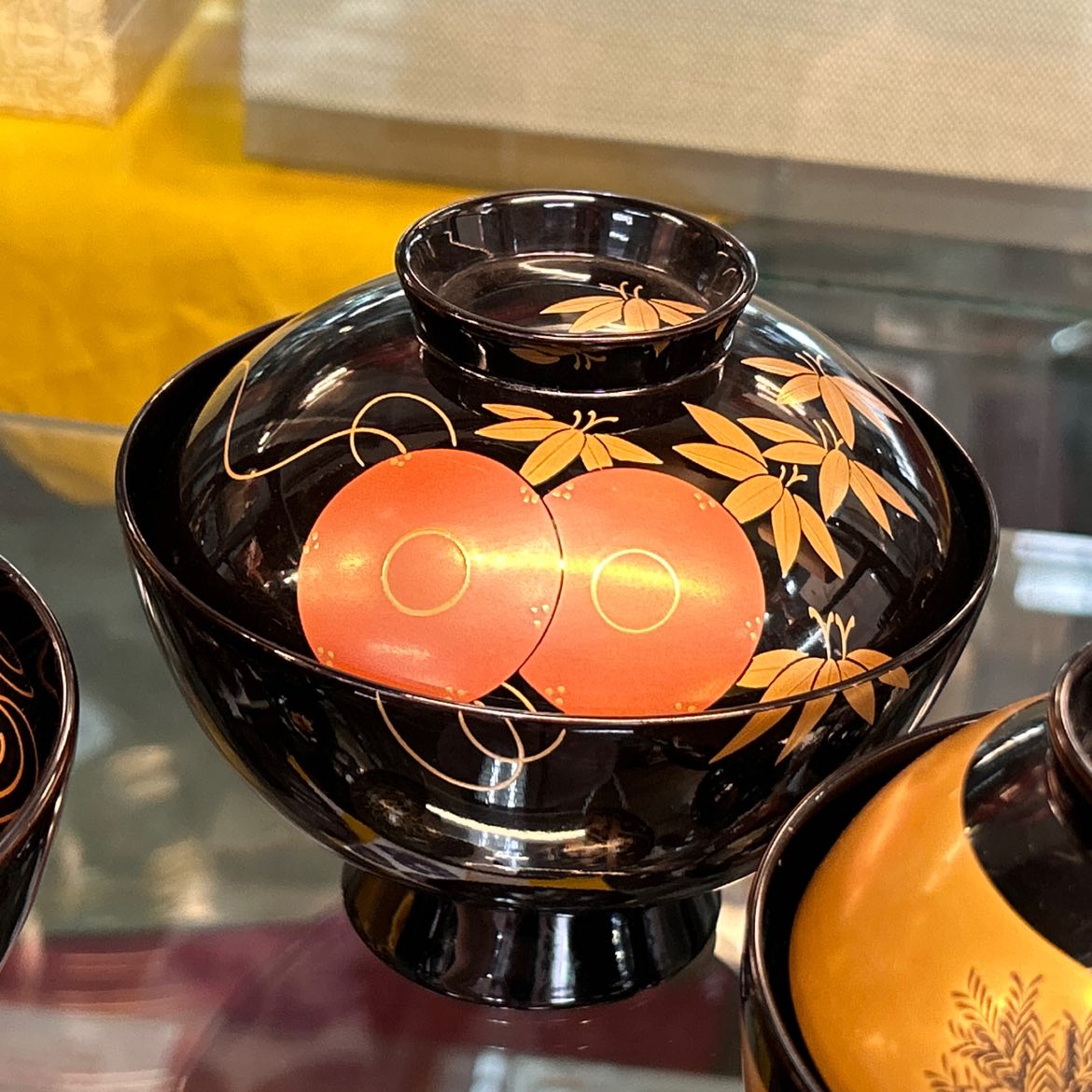 木製黒太鼓に笹吸物椀 輪島塗です-120φx105h(mm)。輪島の凛とした太鼓に笹蒔絵が見事に描かれています。