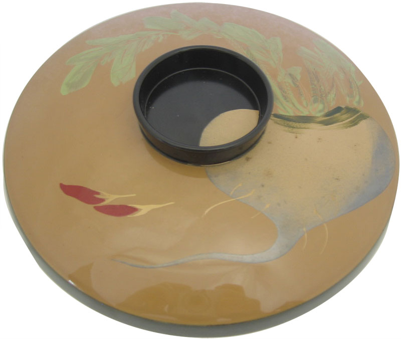 木製白かぶら絵カブセ煮物椀です-137φx80h(mm)。数少ない漆の淡い白の色調のなかにかぶらを描いています。フタモノの器として幅広く使えます。雑煮椀、煮物椀に好適。