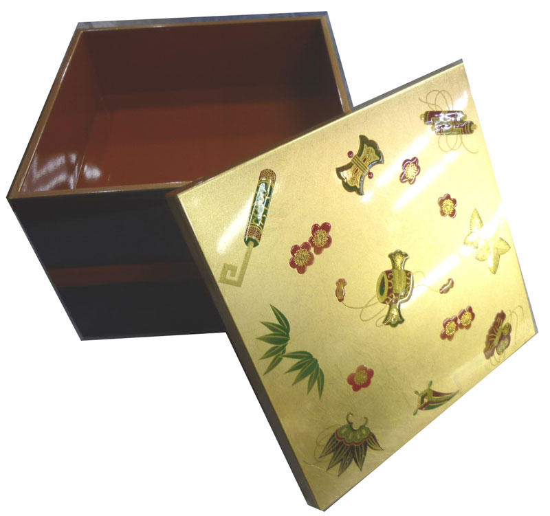 5.0二段重宝づくし(中皿付) 150x150x120 金箔に宝づくし、究極のラッキーアイテム小重 樹脂製