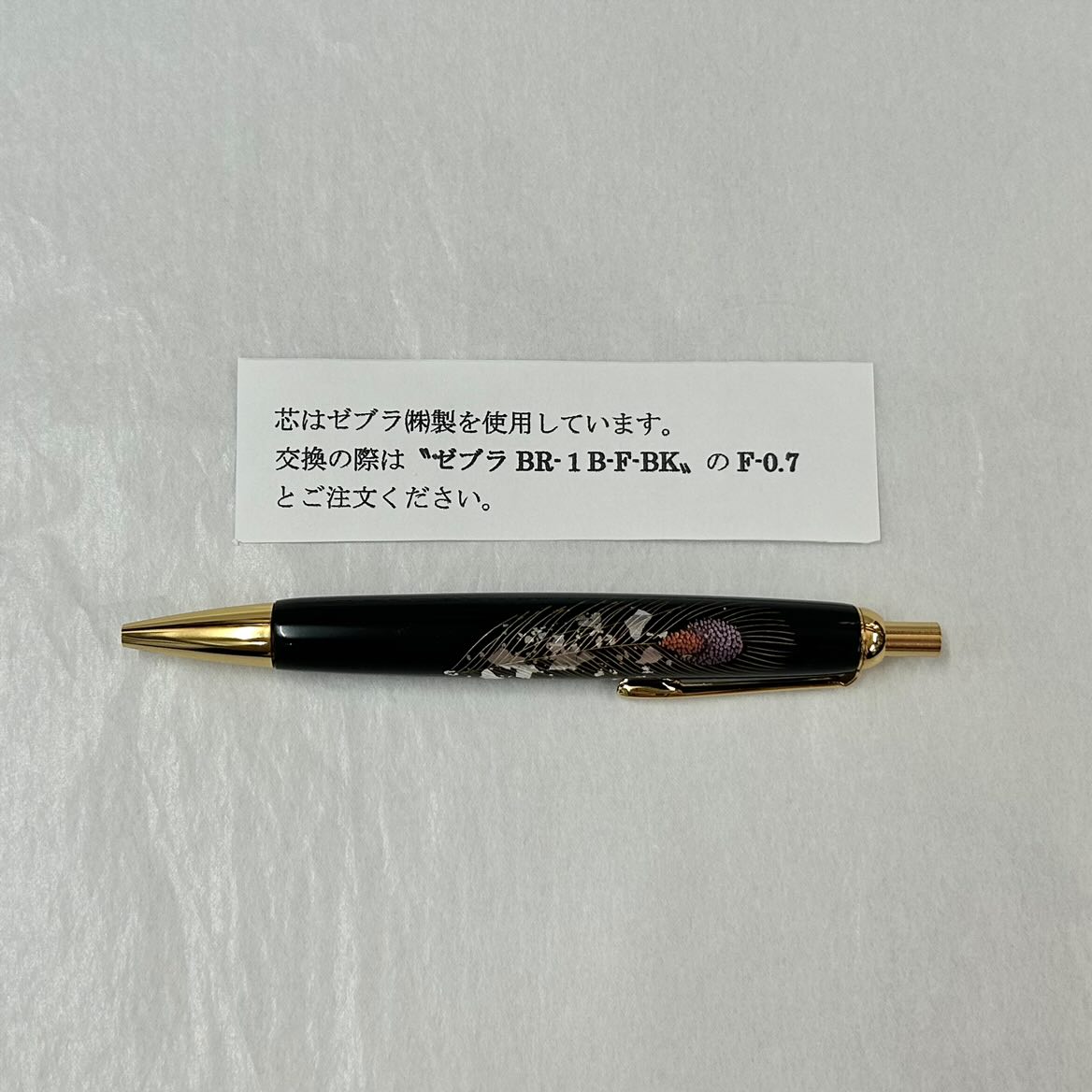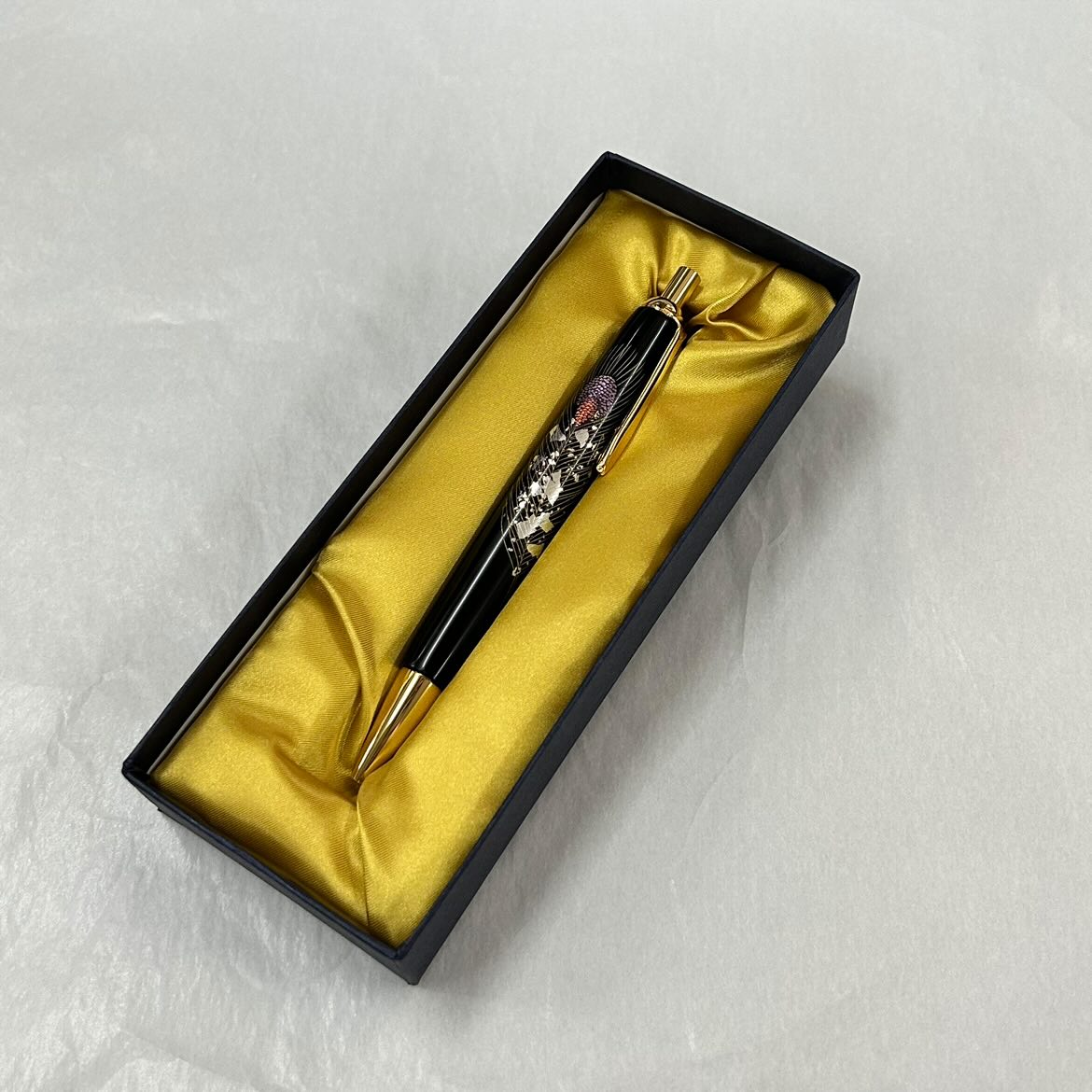 輪島塗漆芸作家がボールペンに漆で羽の模様を描き、金粉等を蒔いて作ったものです。お世話になった上司や、海外の方へのプレゼントに好適です。インクは黒色で、交換式です。