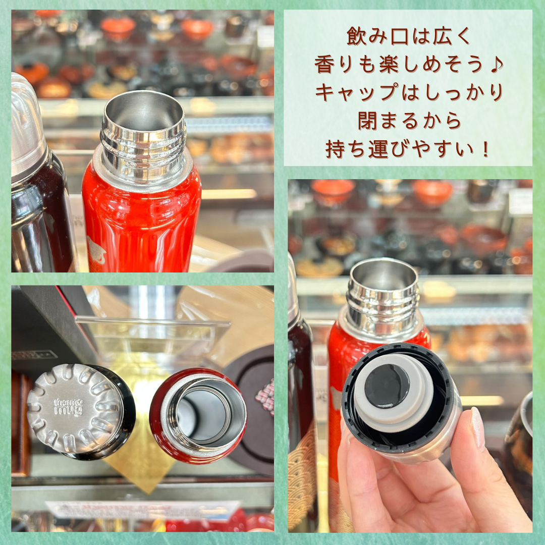 越前漆器とthermo mugのコラボ商品です。持ち運びやすさを追求し、折畳み傘に似た形状にして従来品より軽量化しています。朱色と黒色は漆の手塗りで、縁起の良い和柄が施されています。箱入りで贈呈品にも好適です。
