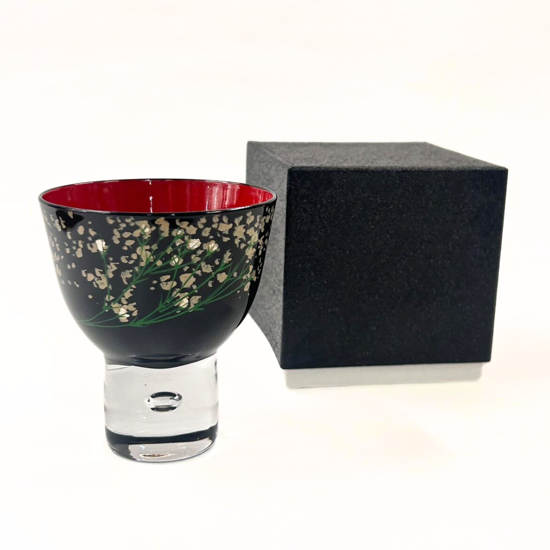 ガラスに漆で塗り加飾した、会津塗の伝統工芸品。 化粧箱入りでギフトにも好適です。 サイズ:φ7.3×8.0cm ガラス製、漆+ウレタン塗、化粧箱入