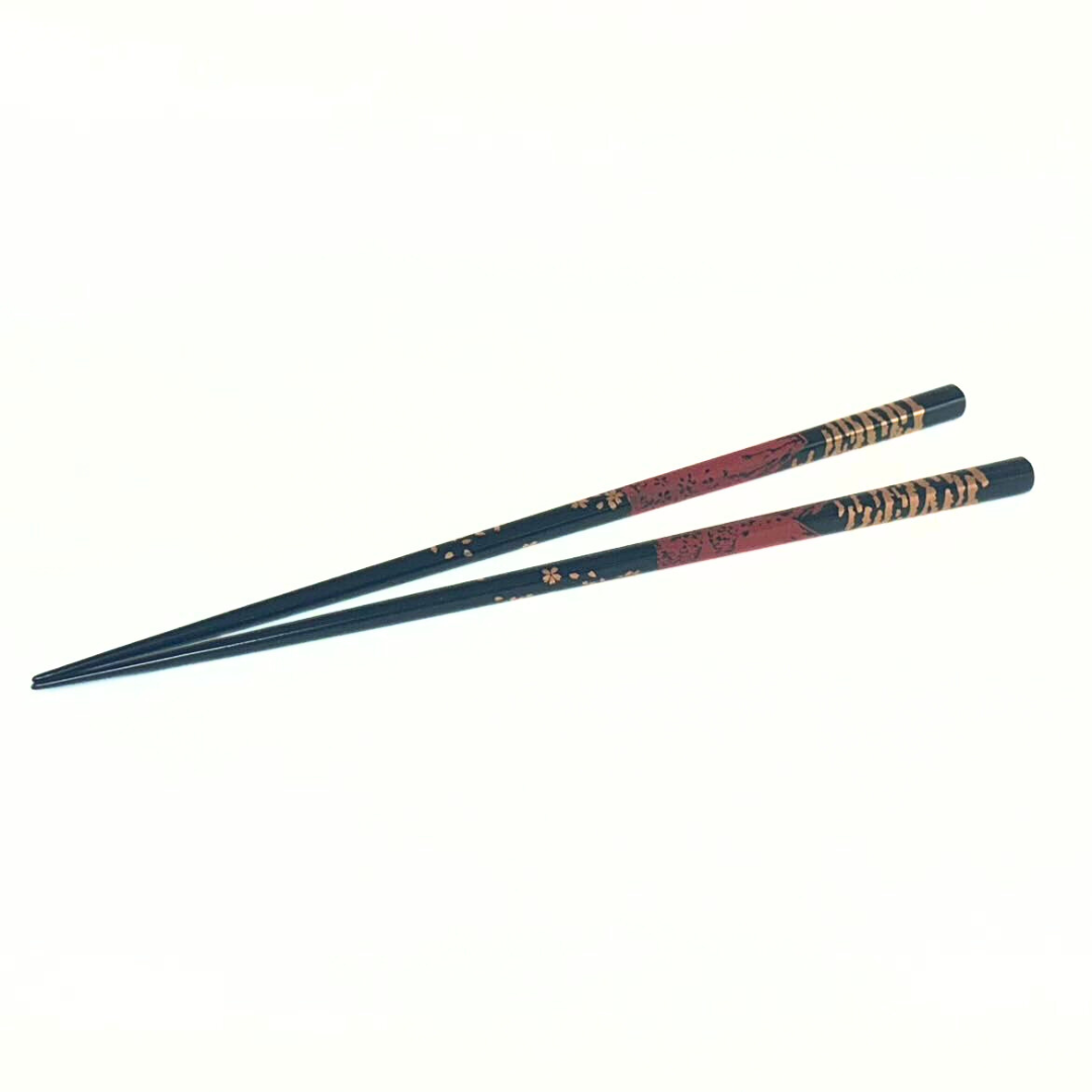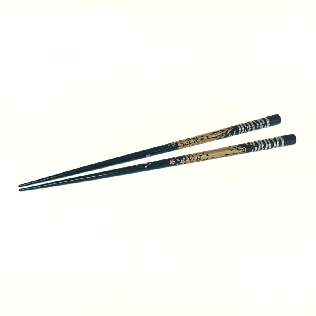 日本の象徴「富士山」と「桜」を優雅に描いた、木製漆塗りのお箸セットです。
