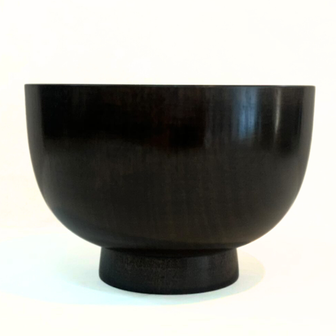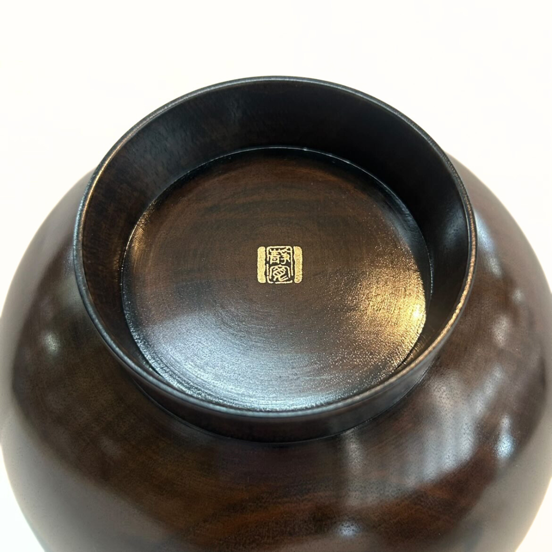 木地、塗すべて国産手作りの木製漆塗で安心、伝統の薄挽きで木目が墨黒に見事に調和しています サイズ:直径15cm×高さ9.4cm