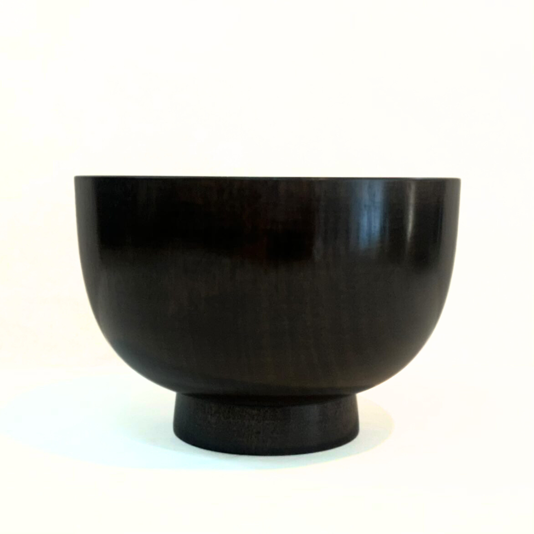木地、塗すべて国産手作りの木製漆塗で安心、伝統の薄挽きで木目が墨黒に見事に調和しています サイズ:直径12.1cmX高さ8cm